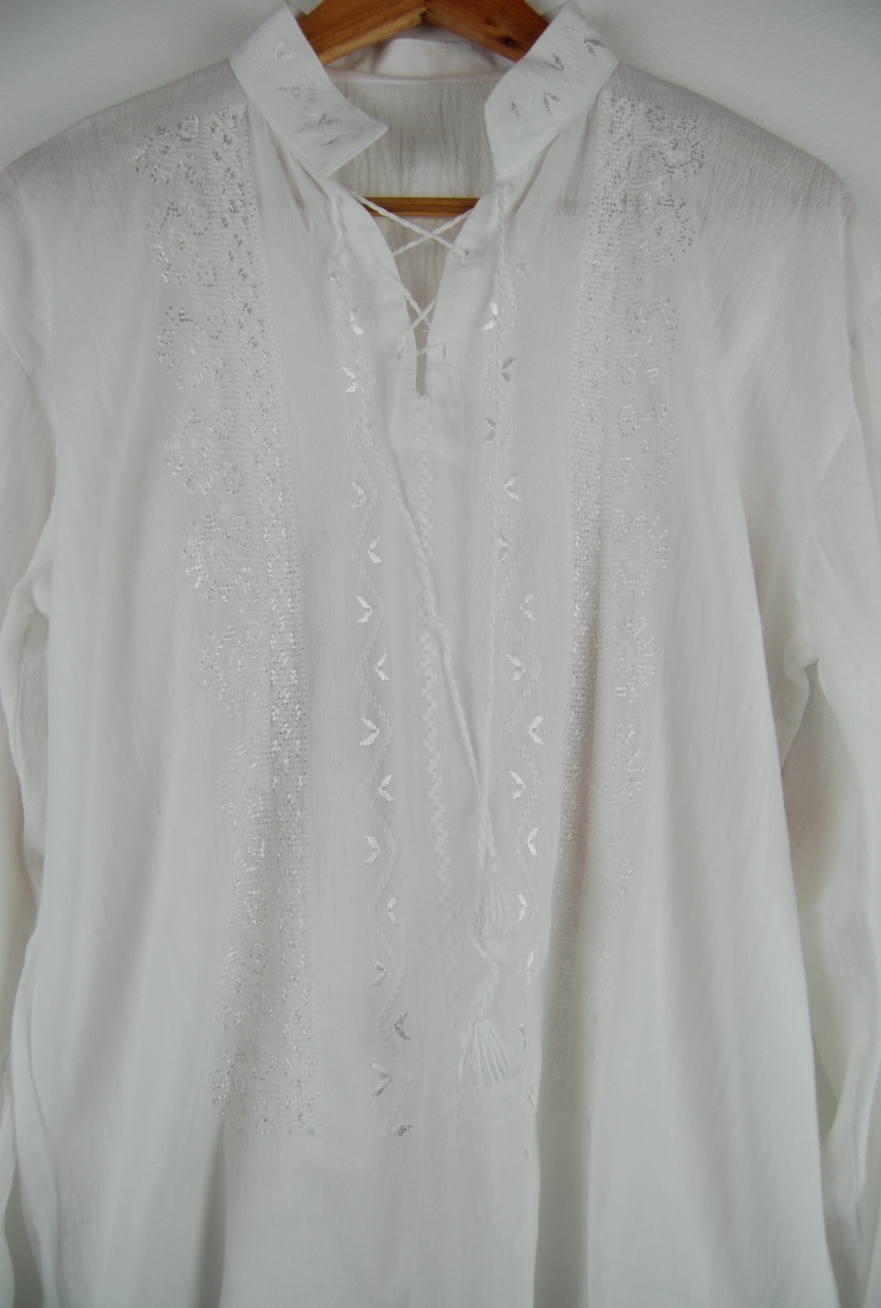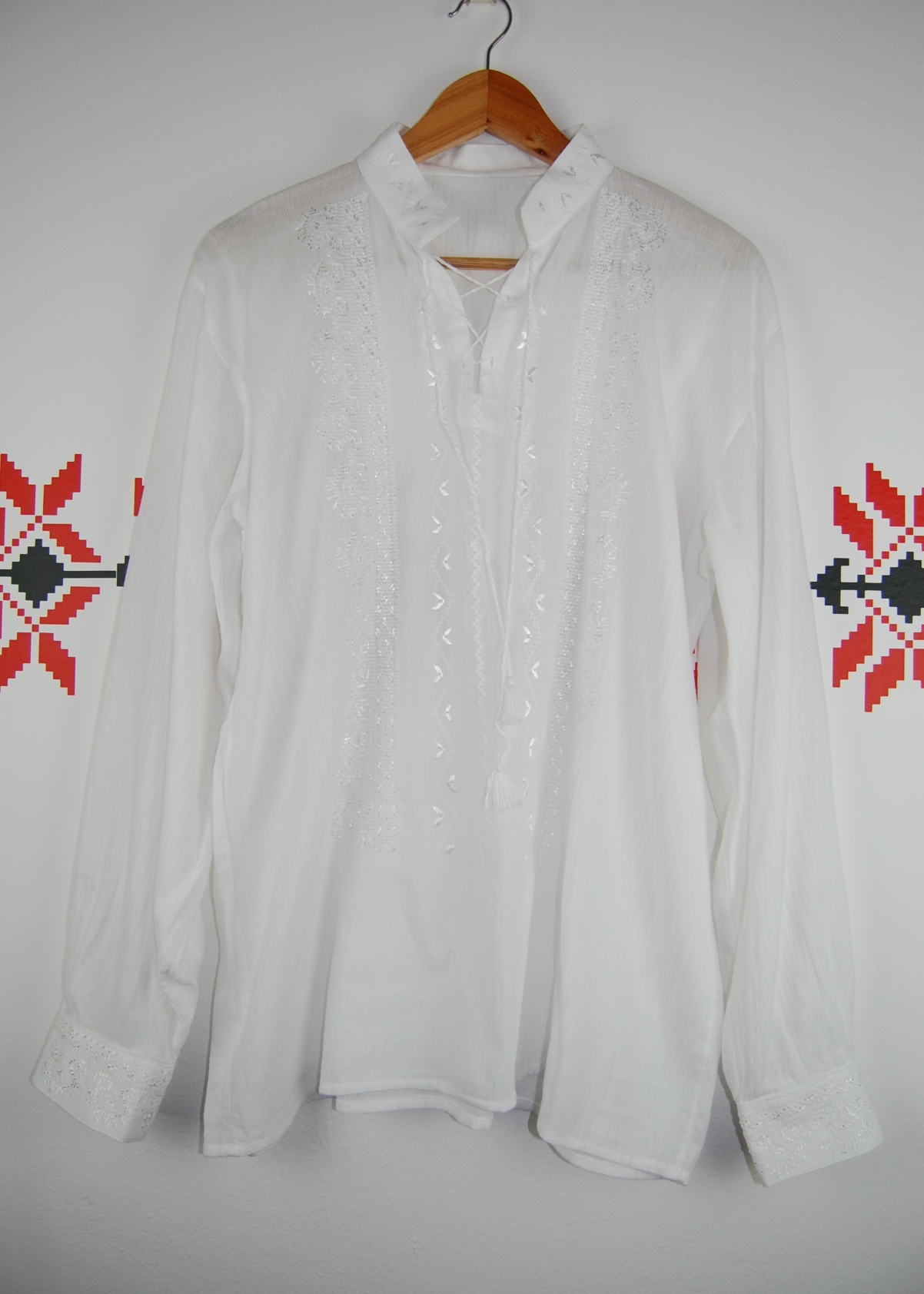 Cămașă cu mânecă lungă inspirată din motive tradiționale românești, brodată integral manual pe pânză topită 100% bumbac.