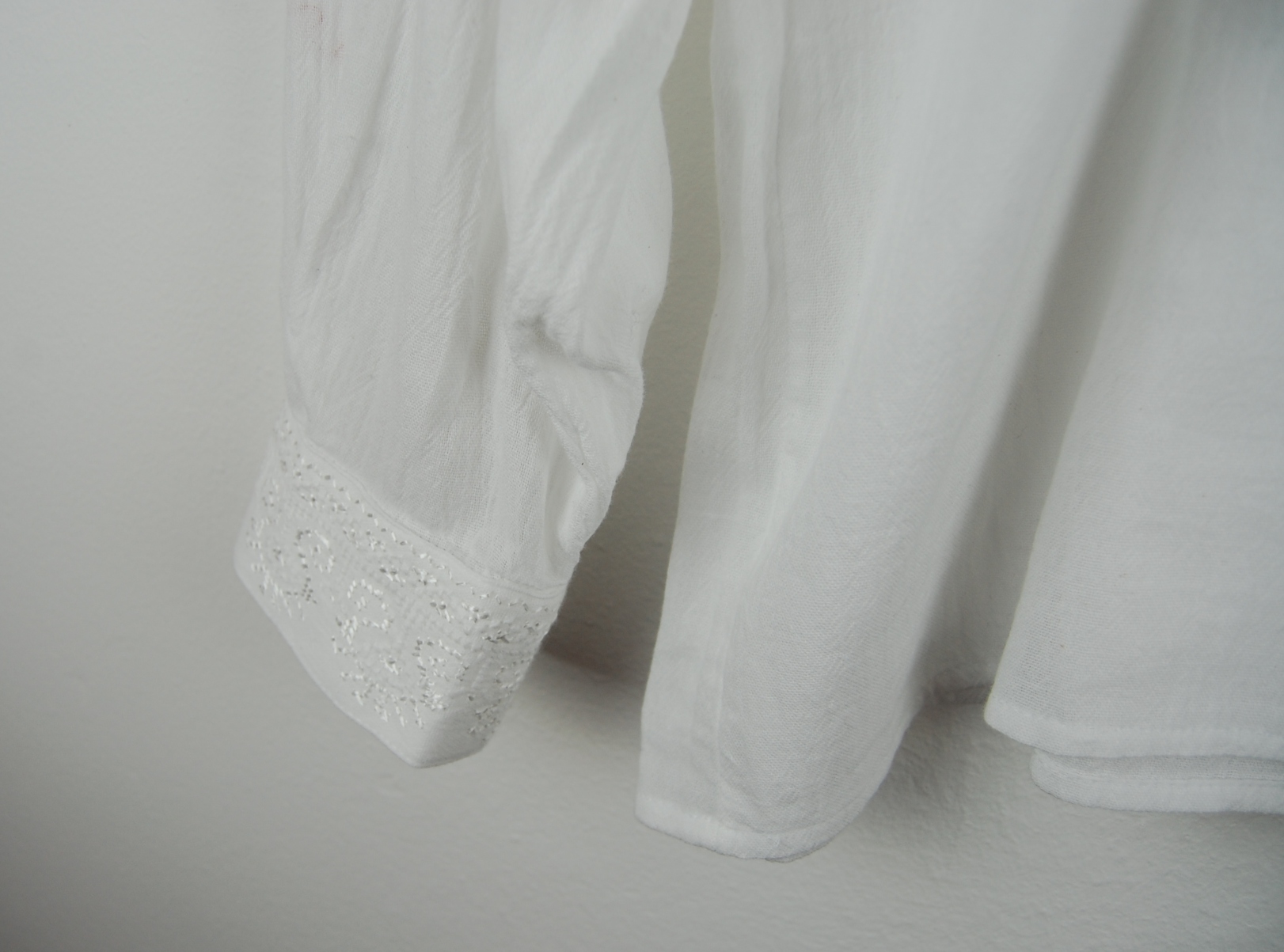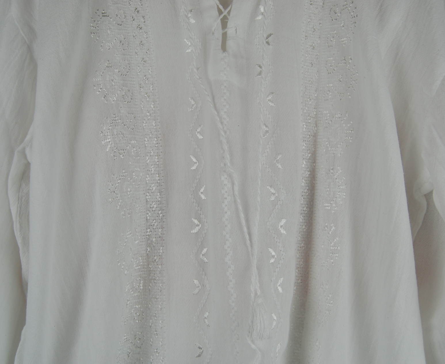 Broderia este cusută doar manual cu fir de bumbac și fir de mătase pe pânză de culoare albă.