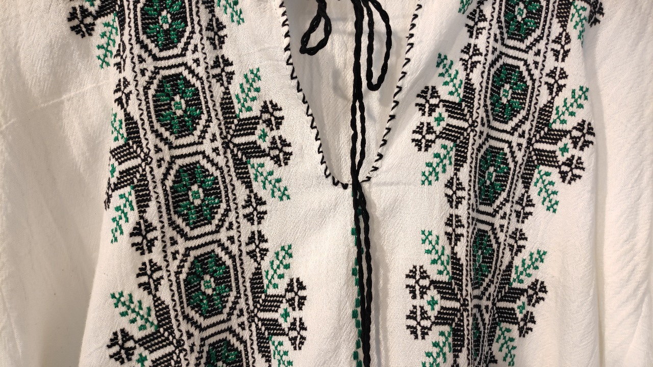 Două șiruri verticale de broderie model „Roatele” sunt cusute pe partea din față a iei. Broderia este cusută doar manual cu fir de bumbac pe pânză de culoare albă.