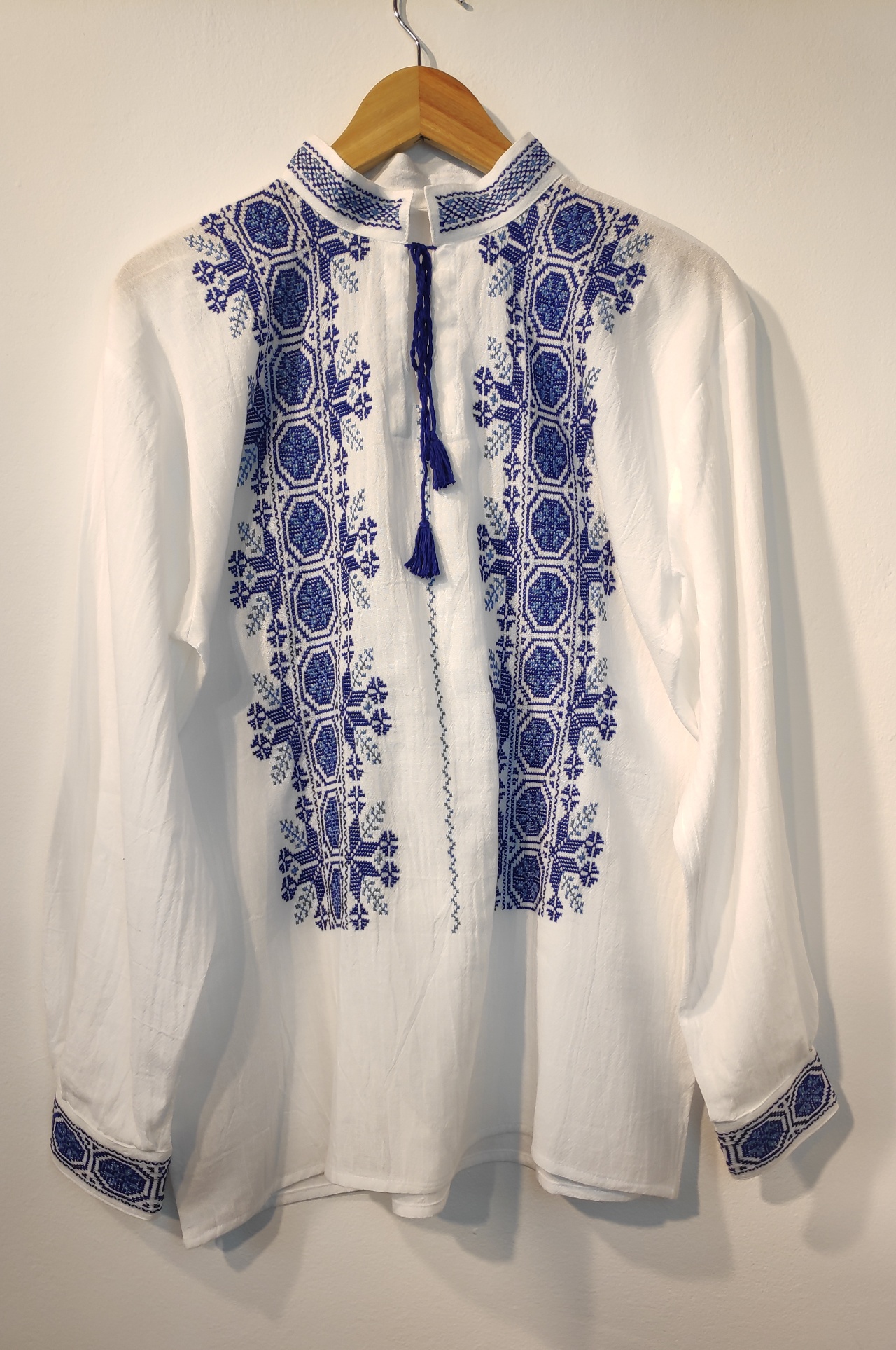 Cămașă cu mânecă lungă inspirată din motive tradiționale românești, brodată integral manual pe pânză topită 100% bumbac.