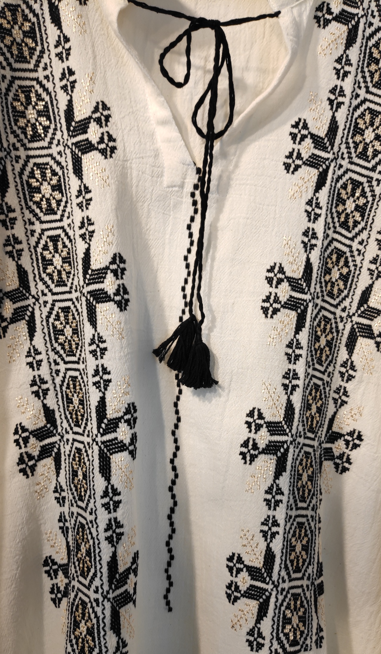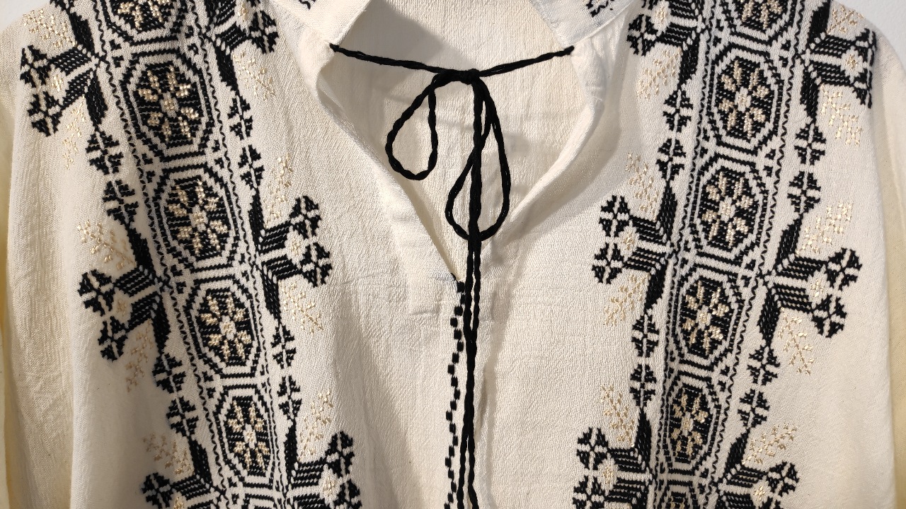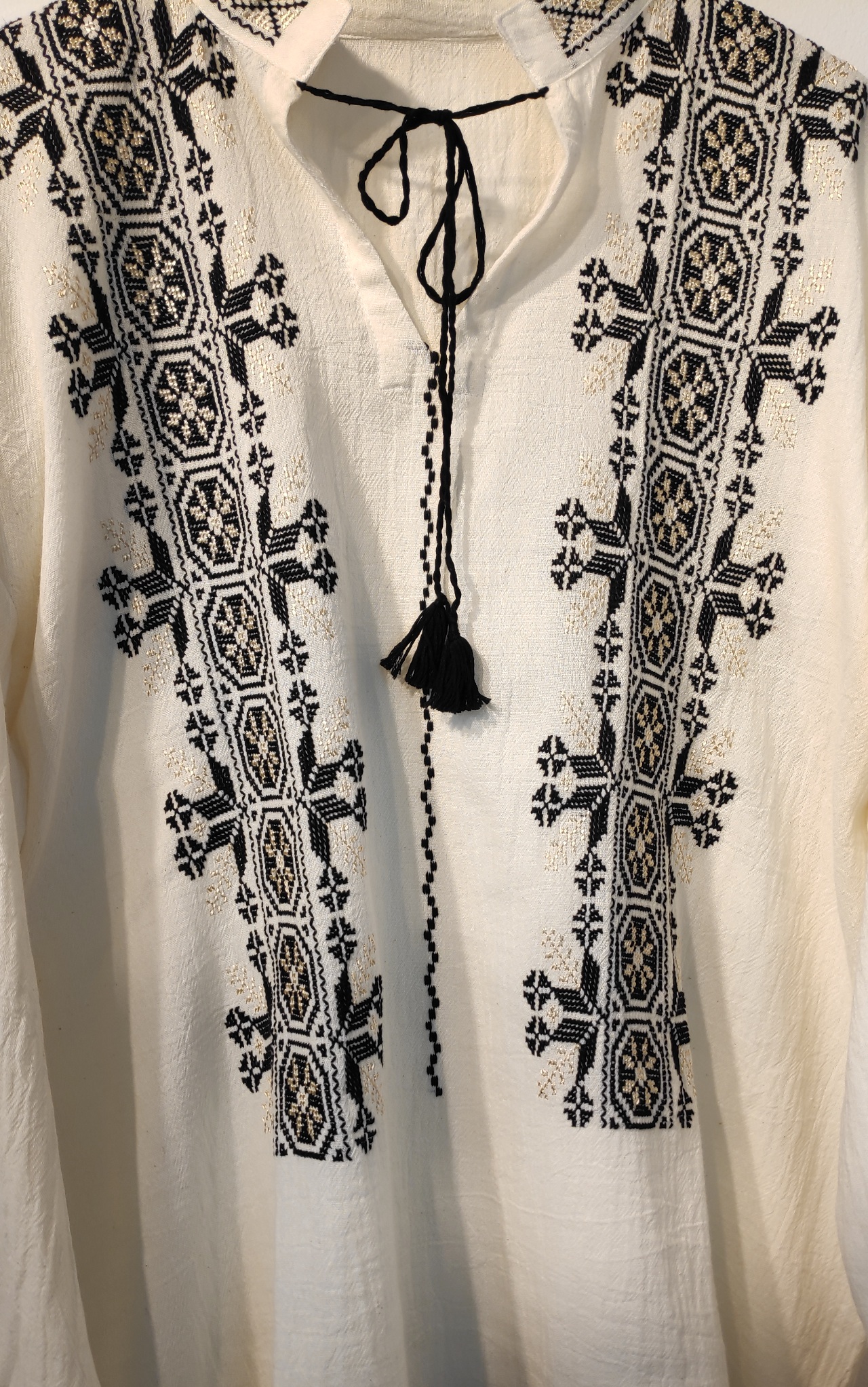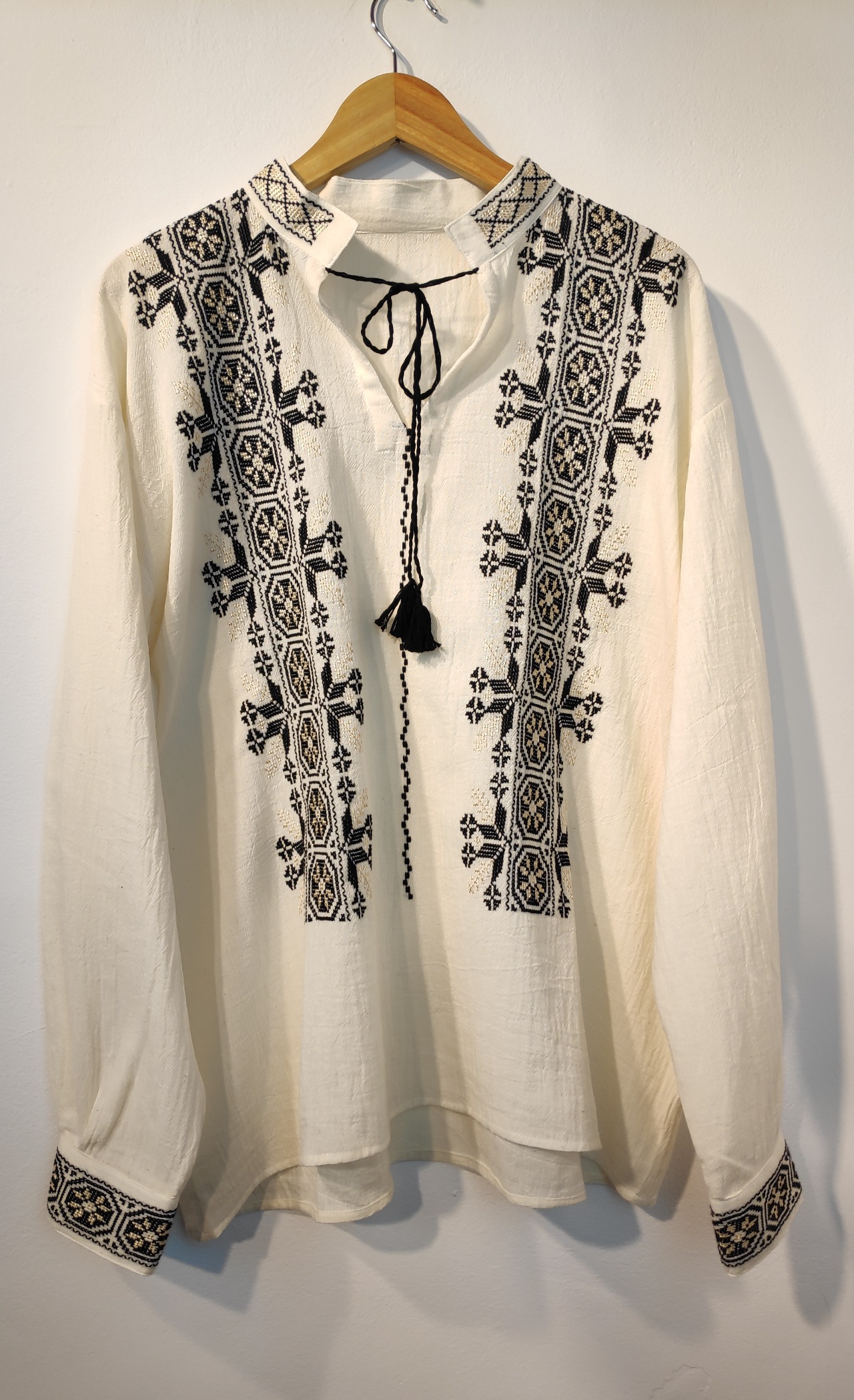 Cămașă cu mânecă lungă inspirată din motive tradiționale românești, brodată integral manual pe pânză topită 100% bumbac.