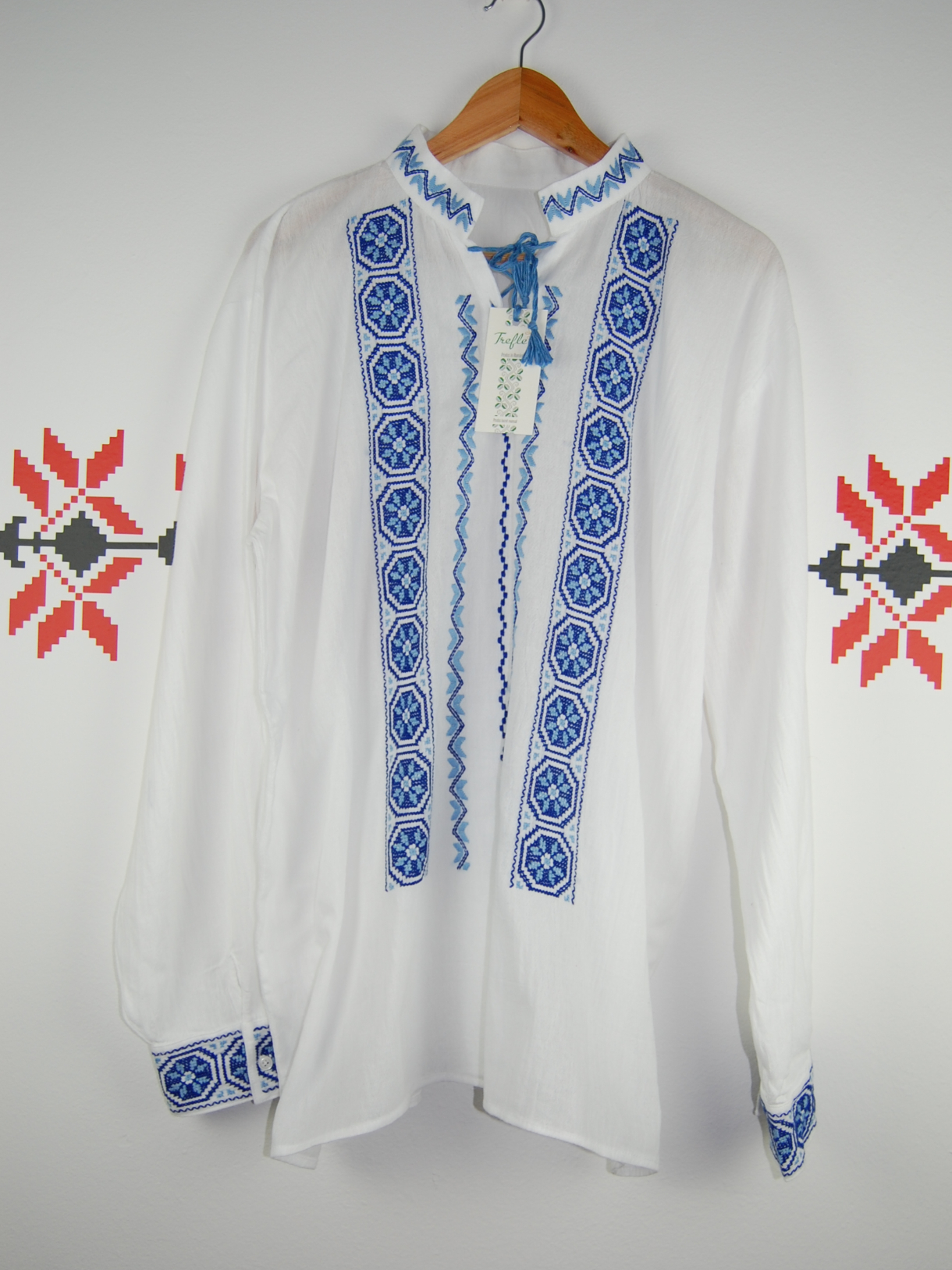 Cămașă cu mânecă lungă inspirată din motive tradiționale românești, brodată integral manual pe pânză topită 100% bumbac.