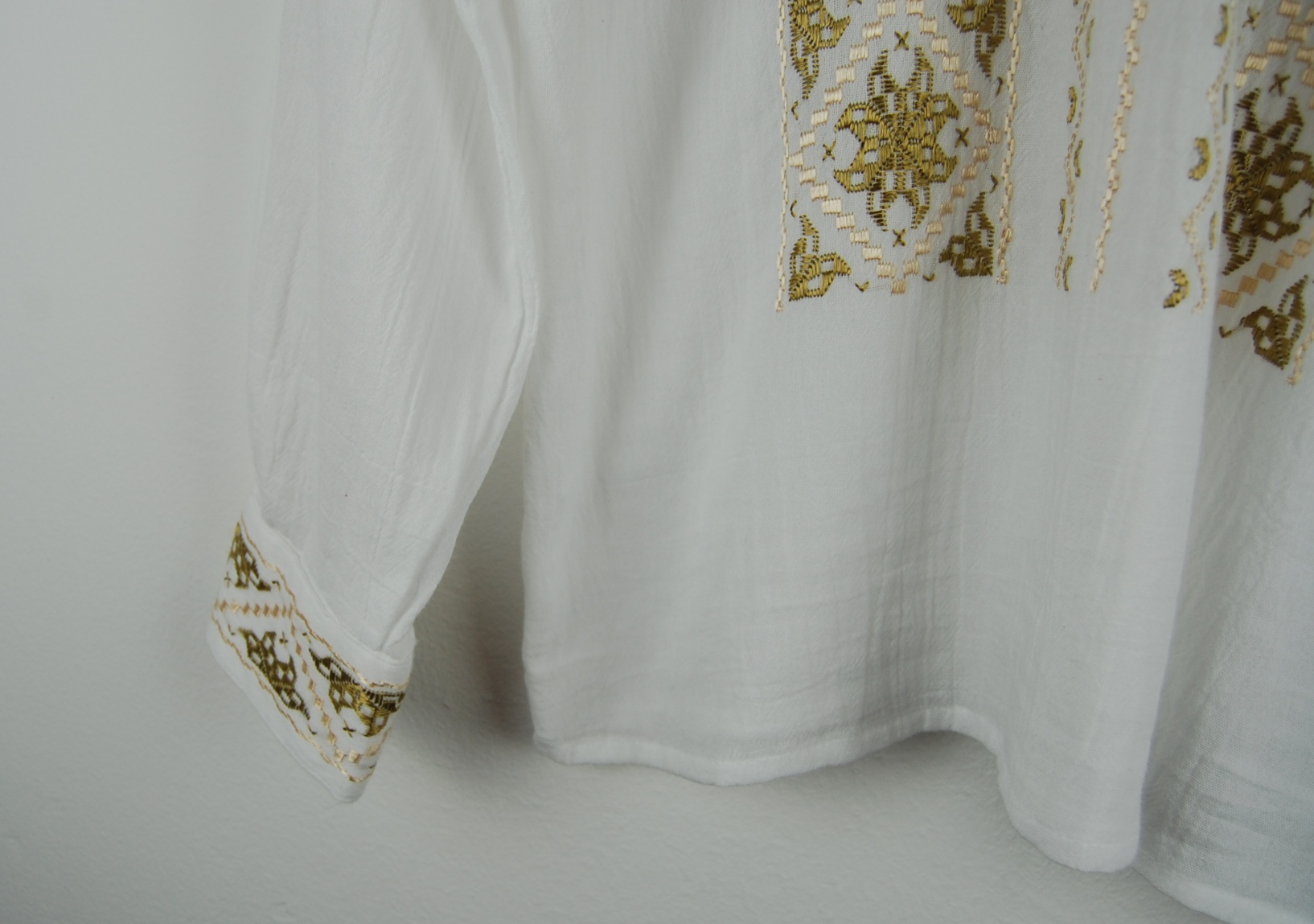 Cămașă cu mânecă lungă inspirată din motive tradiționale românești, brodată integral manual pe pânză topită 100% bumbac.