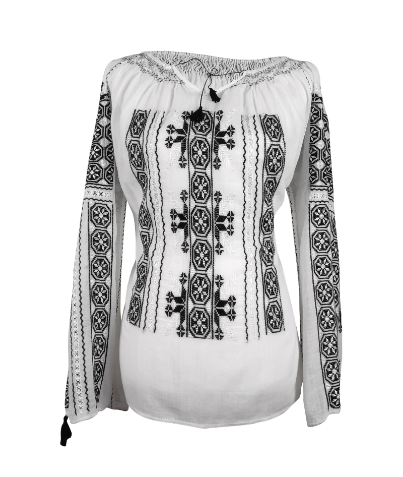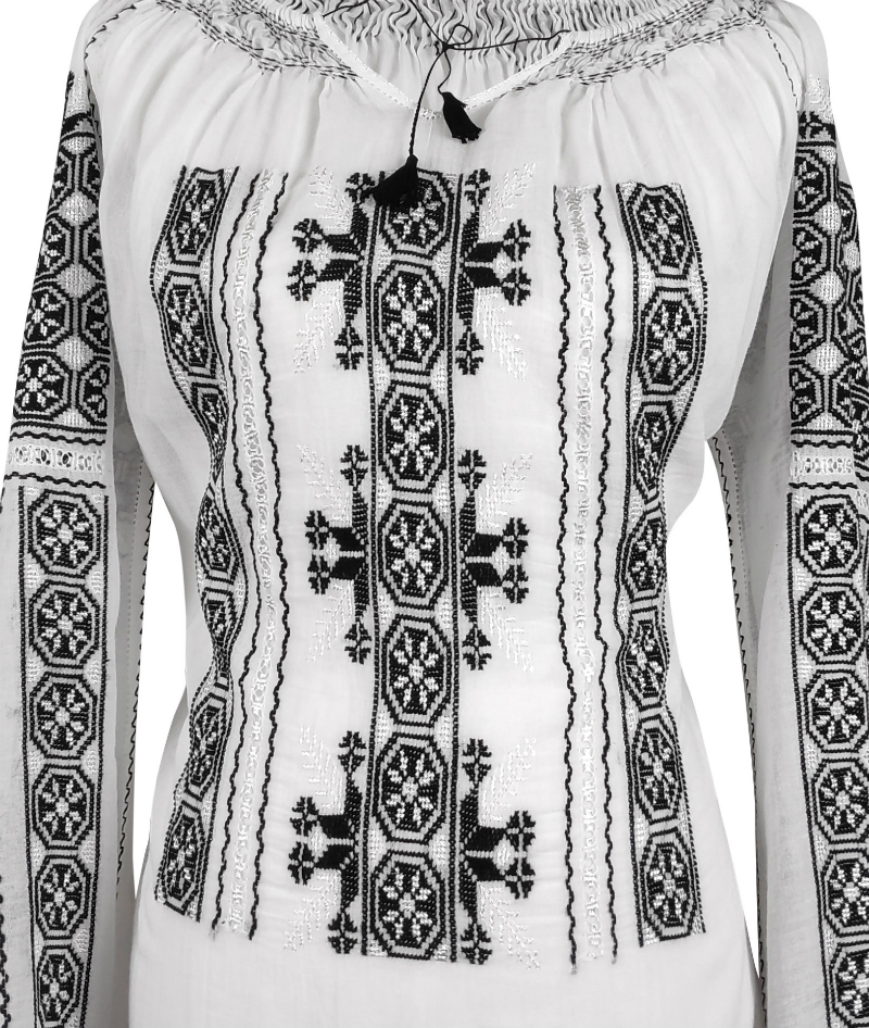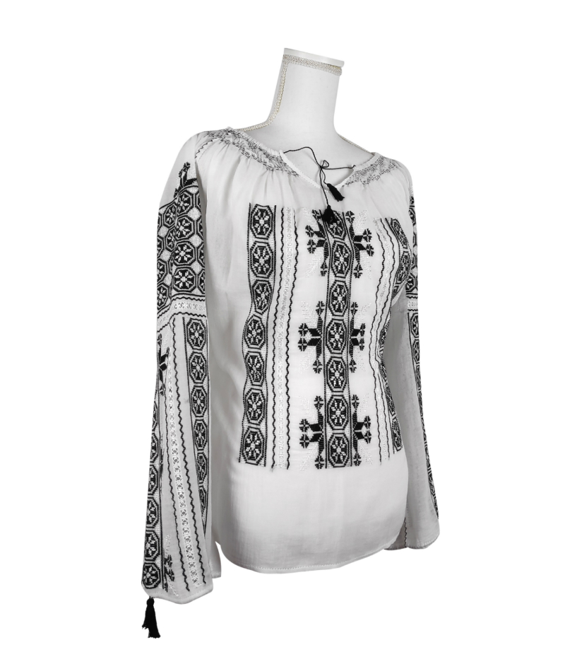 Ie cu mânecă lungă inspirată din motive tradiționale românești, brodată integral manual pe pânză topită 100% bumbac.