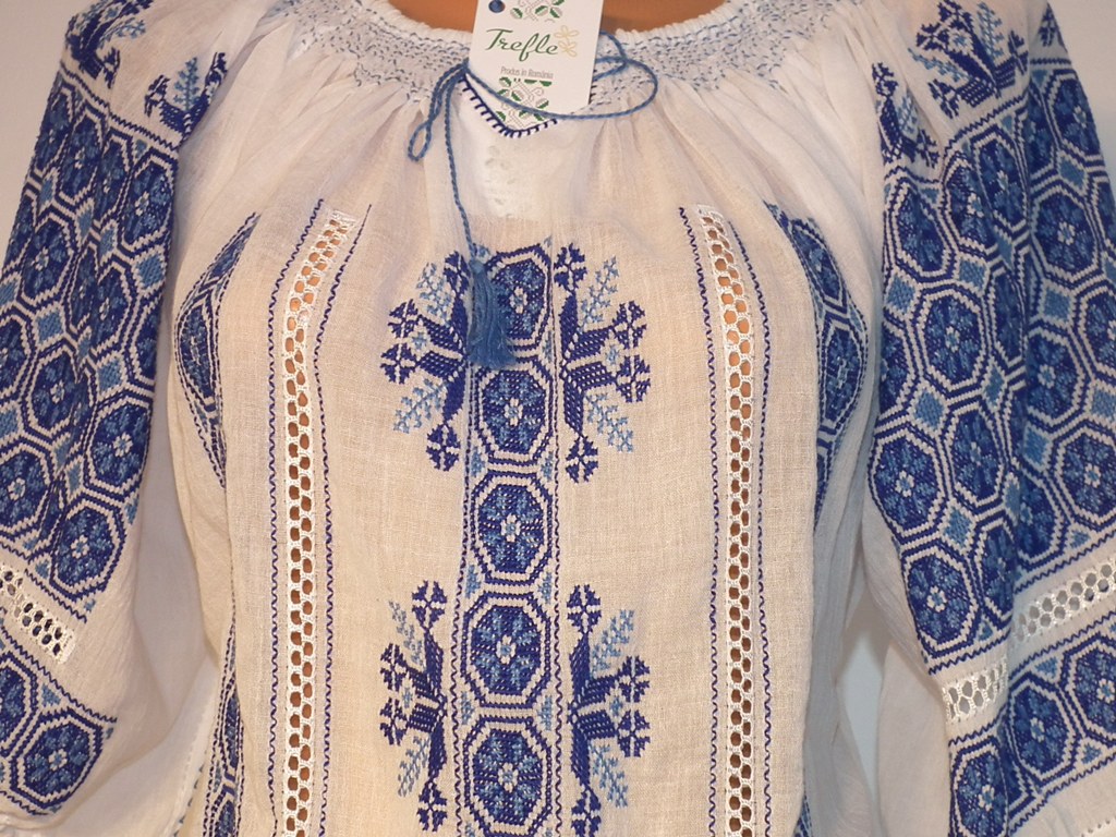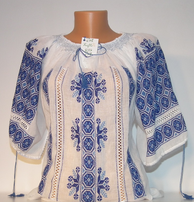 Ie cu mânecă scurtă inspirată din motive tradiționale românești, brodată integral manual pe pânză topită 100% bumbac.